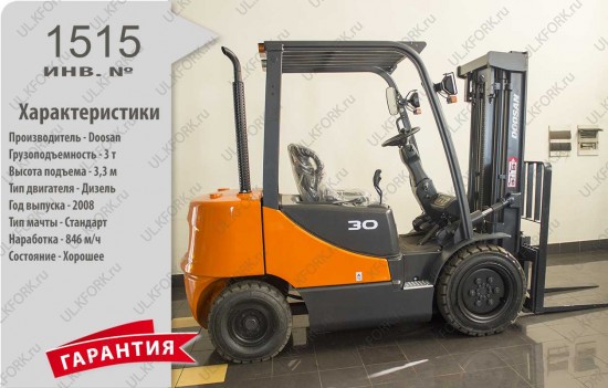 Дизельный автопогрузчик Doosan Б/У с интентарным номером 1515 2008 года выпуска. Состояние - Хорошее. Имеет грузоподъемность 3000 кг. Гарантия: 1 мес или 200 м/час.