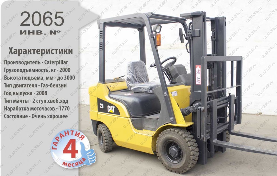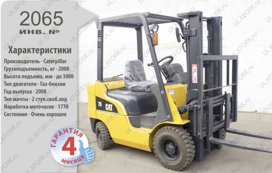 Газ-Бензиновый автопогрузчик Caterpillar Б/У с интентарным номером 2065 2008 года выпуска. Состояние - Хорошее. Имеет грузоподъемность 2000 кг. Гарантия: 4 мес или 500 м/час.