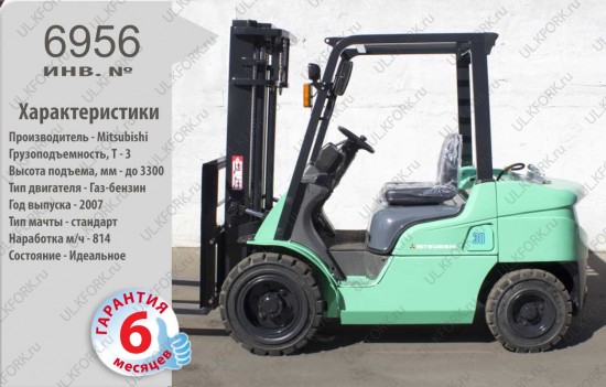 Газ-Бензиновый автопогрузчик Mitsubishi Б/У с интентарным номером 6956 2007 года выпуска. Состояние - Отличное. Имеет грузоподъемность 3000 кг. Гарантия: 6 мес или 800 м/час.