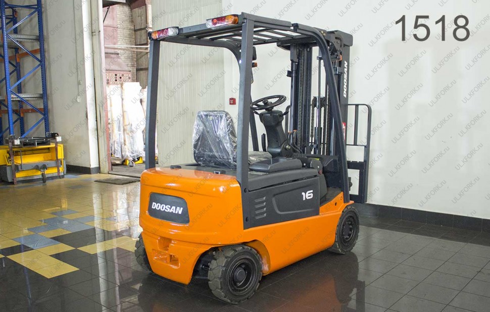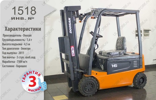 Электрический погрузчик Doosan Б/У с интентарным номером 1518 2011 года выпуска. Состояние - Хорошее. Имеет грузоподъемность 1600 кг. Гарантия: 3 мес или 500 м/час.