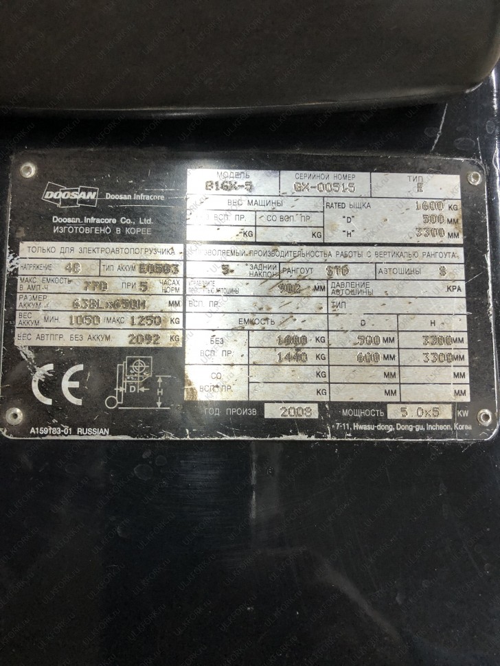 Электрический электропогрузчик Doosan B15T-5 с инвентарным номером КМ046 2013 года выпуска. Имеет грузоподъемность 1500 кг.