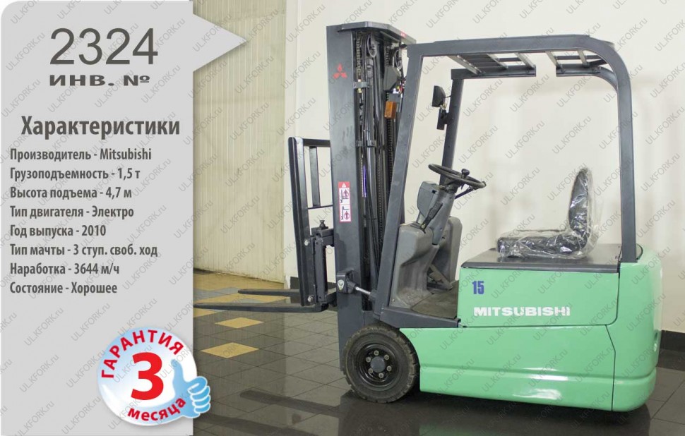Электрический погрузчик Mitsubishi Б/У с интентарным номером 2324 2010 года выпуска. Состояние - Хорошее. Имеет грузоподъемность 1500 кг. Гарантия: 3 мес или 500 м/час.